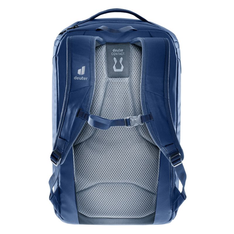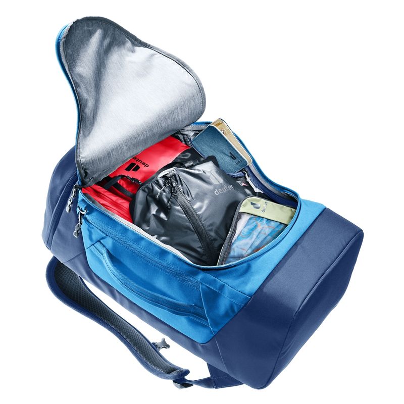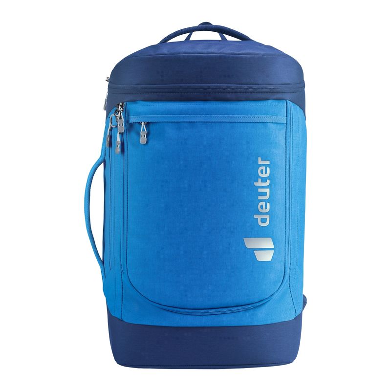 La mochila Duffel Pro Pack incorpora el sistema de espalda Deuter Contact, con correas acolchadas para los hombros y asas. Cuenta con una funda pasante en la parte trasera para sujetarla al asa extraíble de una maleta o bolso con ruedas.