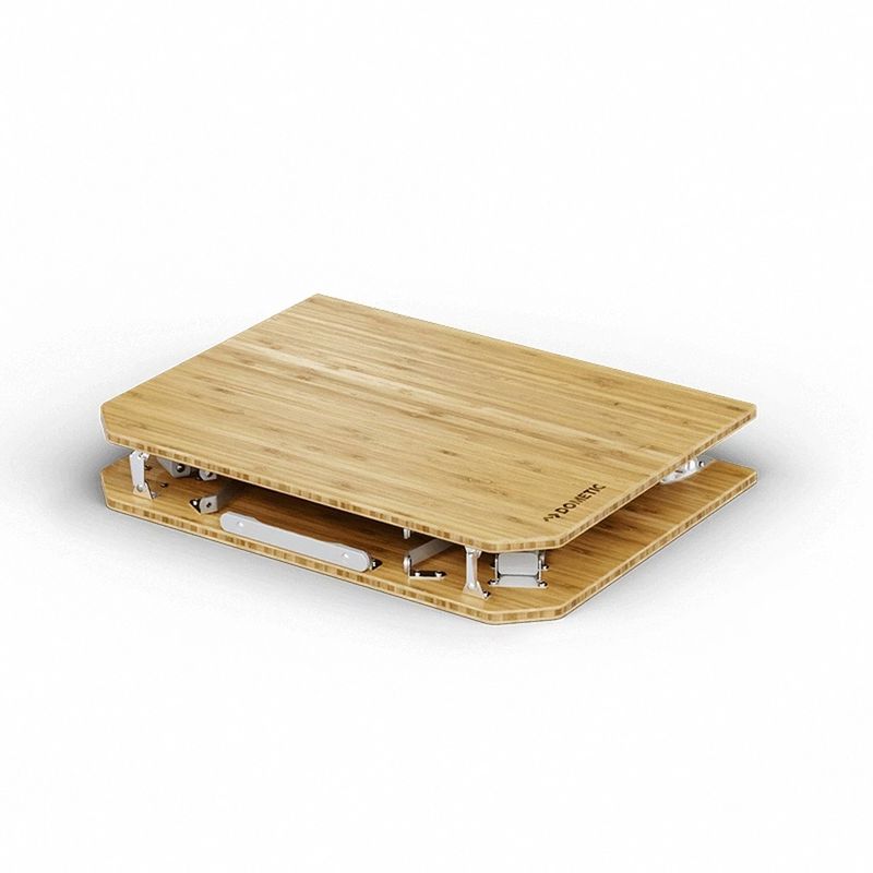 Construido con bambú sólido (superficie) y aluminio (patas), con un asa de transporte integrada.