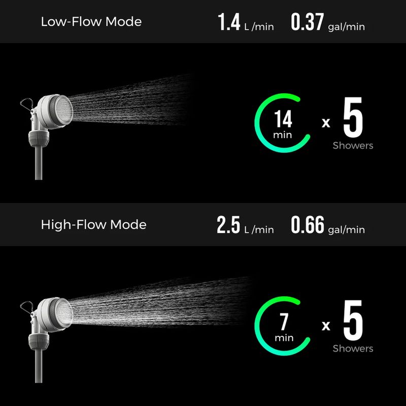 Todo el kit se guarda de forma compacta dentro de la propia bolsa, ofreciendo una solución de ducha portátil, ligera y práctica para acompañarte en cualquier aventura.