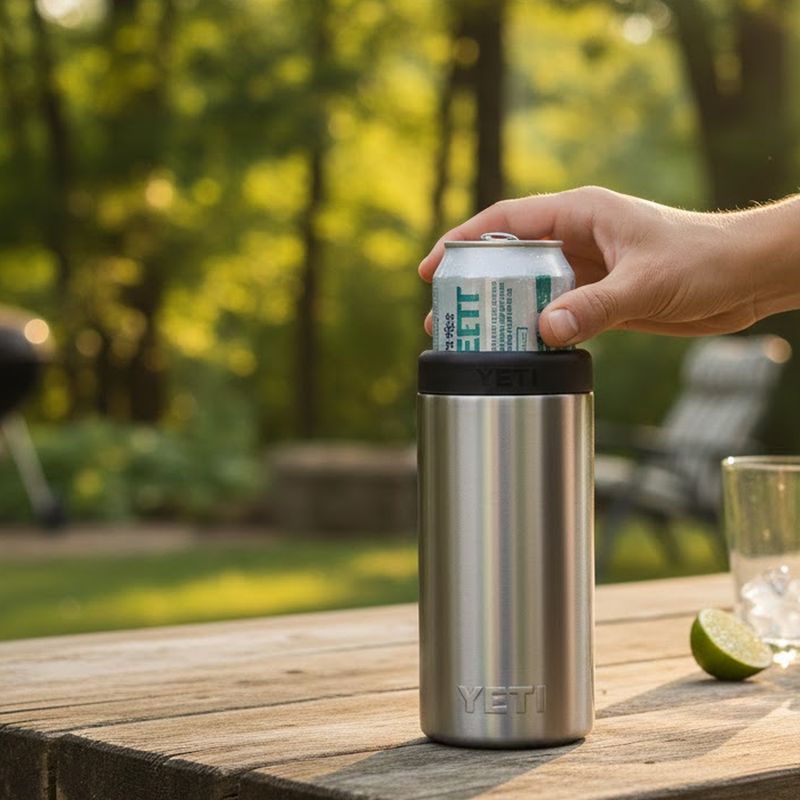 El YETI Rambler enfriador de lata de 250 ml está diseñado para conservar tus bebidas frías por más tiempo. Fabricado en acero inoxidable con aislamiento térmico, ofrece durabilidad y practicidad para el uso diario, reuniones o actividades al aire libre, con un acabado moderno en Aluminio.