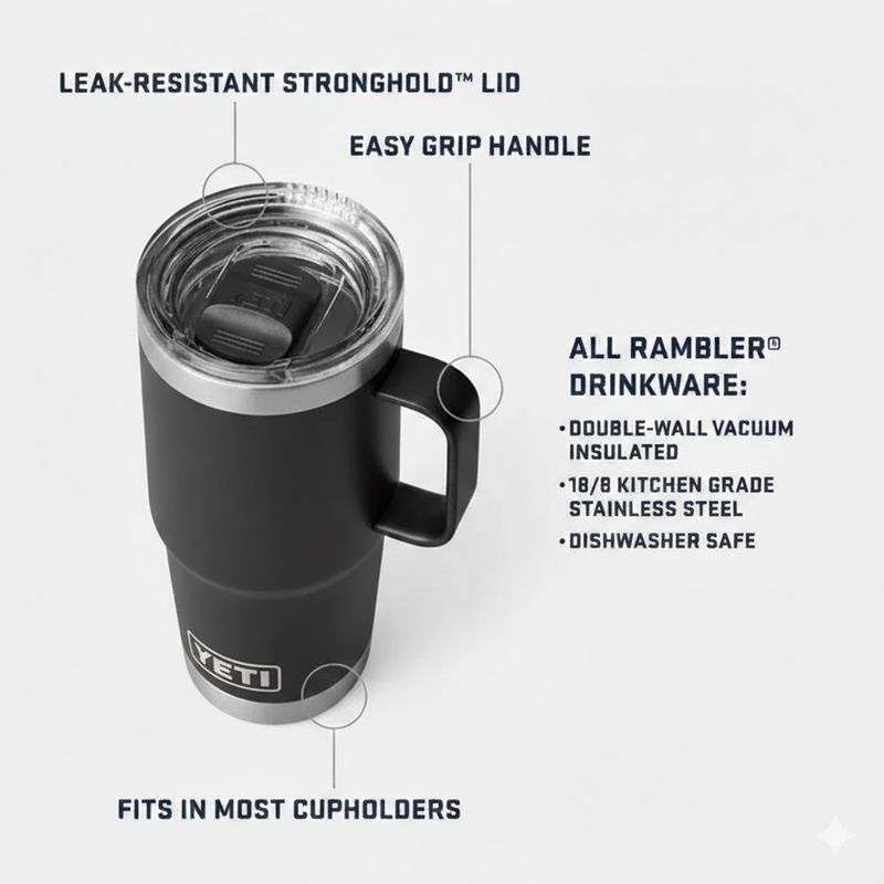 La taza de viaje YETI Rambler de 591 ml en color Negro está diseñada para acompañarte en el día a día, manteniendo tus bebidas calientes o frías por más tiempo gracias a su aislamiento térmico. Su construcción resistente y diseño práctico la hacen ideal para la oficina, viajes y actividades outdoor. Durabilidad y comodidad en cada sorbo.
